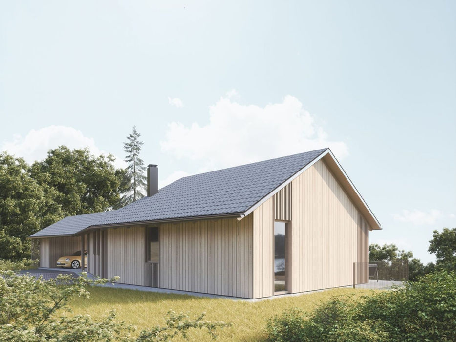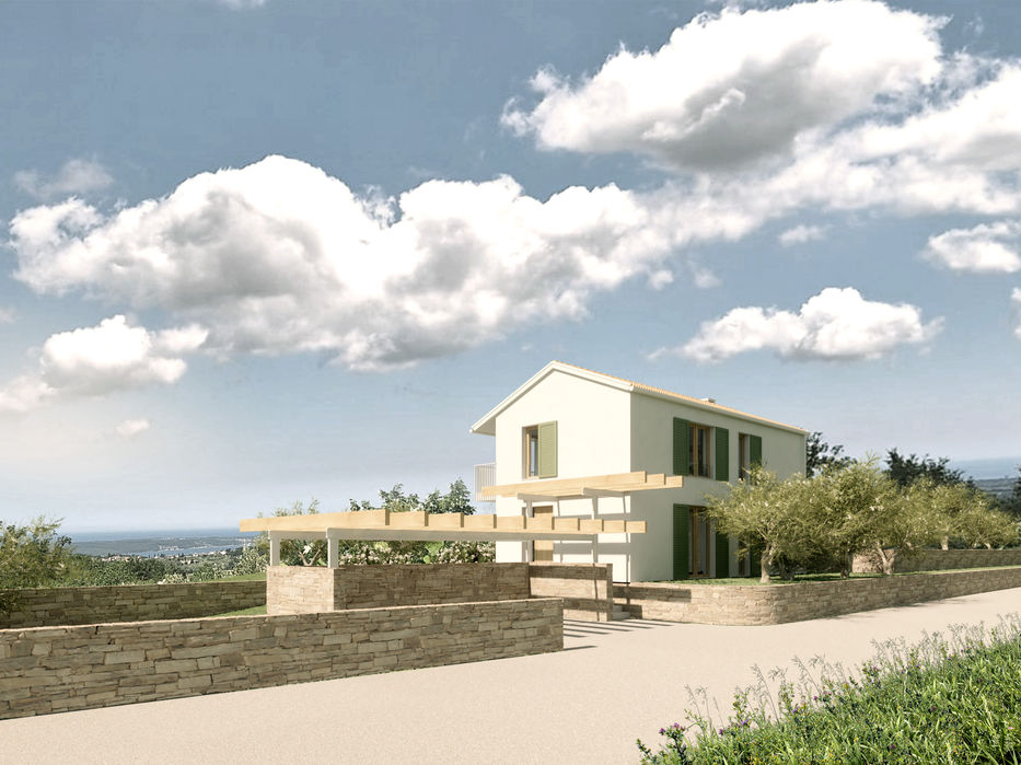 Enostanovanjski objekt je lesena pritlična stavba, umeščena skladno z razgibanim terenom parcele v vaškem zaselku. Volumen stavbe je značilna podeželska hiša z dvokapno streho, pravokotnega zalomljenega tlorisa z dodano nadstrešnico za avtomobile in kolesarnico.